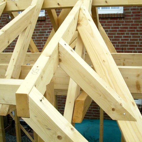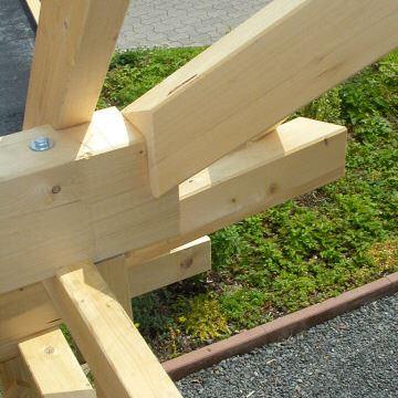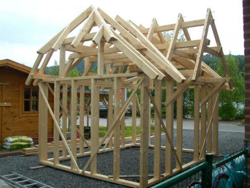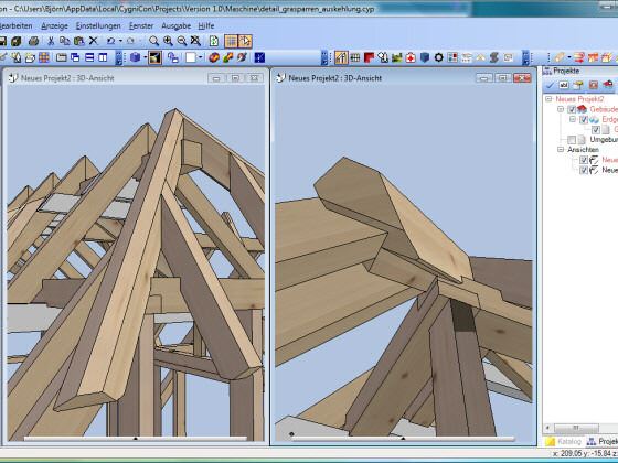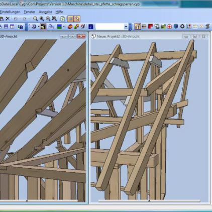 Im Jahr 2008 haben wir ein CAD/CAM - Modul auf Basis von Cygnicon entwickelt. Vor der Freigabe der ersten Version wurde ein Praxistest durchgeführt. Dafür wurde ein Musterhaus geplant, gefertigt und aufgestellt. Natürlich wurden sämtliche Planungen und Arbeitsvorbereitungen mit dem von uns entwickelten CAD/CAM - Modul durchgeführt. So wurde die Tragkonstruktion konstruiert und die Holzverbindungen ausgearbeitet. Weiterhin die Montagezeichungen geplottet sowie die CNC-Ansteuerung für den Holzzuschnitt erzeugt. Um eine möglichst große Vielfalt an Varianten zu testen wurden bewusst ungewöhnliche Konstruktionen gewählt. Der Holzbalkenzuschnitt erfolgte mit einer CNC-Maschine vom Typ Hundegger K2-5. Beim Richten konnten wie alle Bauteile passgenau ohne Nachbearbeitungen zusammen fügen. Lediglich bei der 3D-Tasche mussten wir eine kleine Korrektur durchführen. Hier hatten wir Übersehen das die Rotationsreihenfolge nicht X,Y-Z ist. Das hatte zur Folge das das linke schräge Kopfband nicht passte. Wir korrigieten das umgehenden und ließen das Bauteil nochmals fertigen.